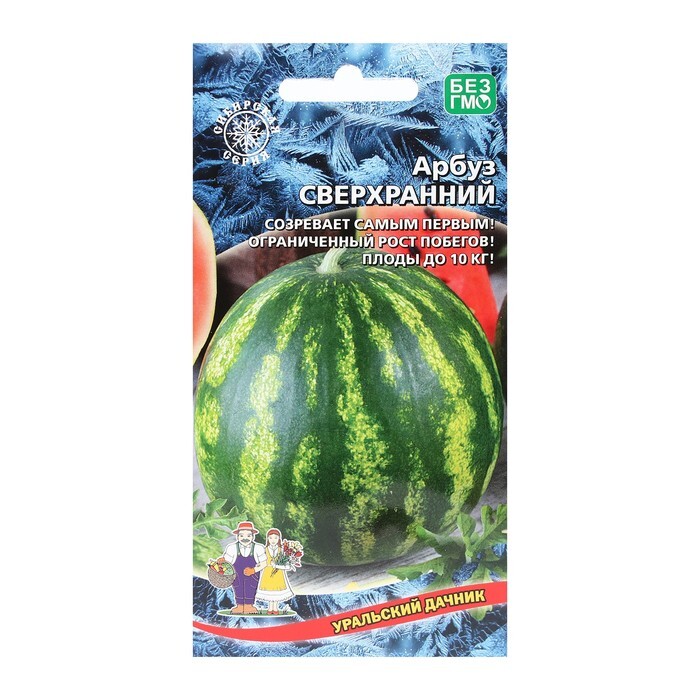 Высокоурожайный, ультраскороспелый сорт. Куст с естественным ограничением роста боковых побегов: после третьего узла боковые побеги не появляются. Отсутствуют также усики, вместо них формируется пучок мужских цветков. Идеально подходит для выращивания в теплице. Плоды округло–овальные, полосатые, семена крапчатые. Мякоть ярко-красная, зернистая, очень сладкая. Плоды при хорошем орошении могут достигать 10 кг, средняя масса 4-6 кг.