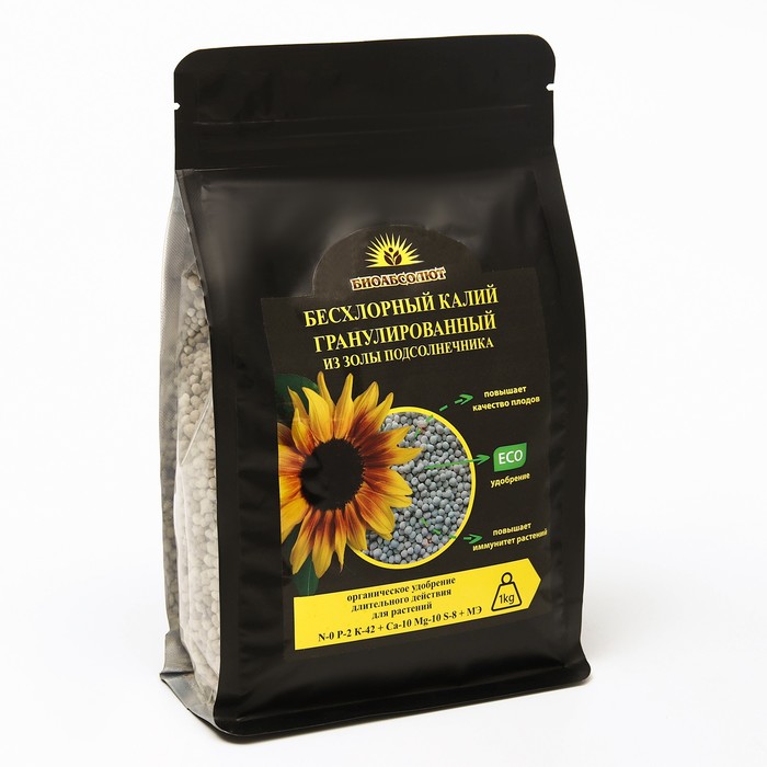 Бесхлорный калий гранулированный (БКГ) - инновационное гранулированное минеральное экоудобрение. Сырье для удобрения имеет природное происхождение из золы шелухи подсолнечника и не содержит хлор. Эффективное комплексное минеральное удобрение «БКГ» применяется в питательных грунтах для выращивания цветочной и овощной рассады, является отличным средством борьбы с вредителями и обладает профилактическими свойствами для противостояния различным болезням. Идеально подходит для корнеплодов и цветочных культур.