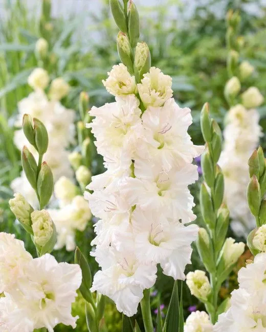 Гладиолус "Ivory Perfection" оправдывает своё название, излучая спокойную изысканность и непреходящую красоту. Из аккуратных вееров зелёных мечевидных листьев поднимаются высокие, изящные стебли, украшенные безупречными цветами цвета слоновой кости. Каждый цветок словно мягко светится, улавливая свет, словно изысканный фарфор, и привносит непринуждённое спокойствие в сад позднего лета. Чистота окраски делает этот сорт наиболее подходящим для создания спокойных, гармоничных композиций или для создания контраста среди насыщенных многолетников.