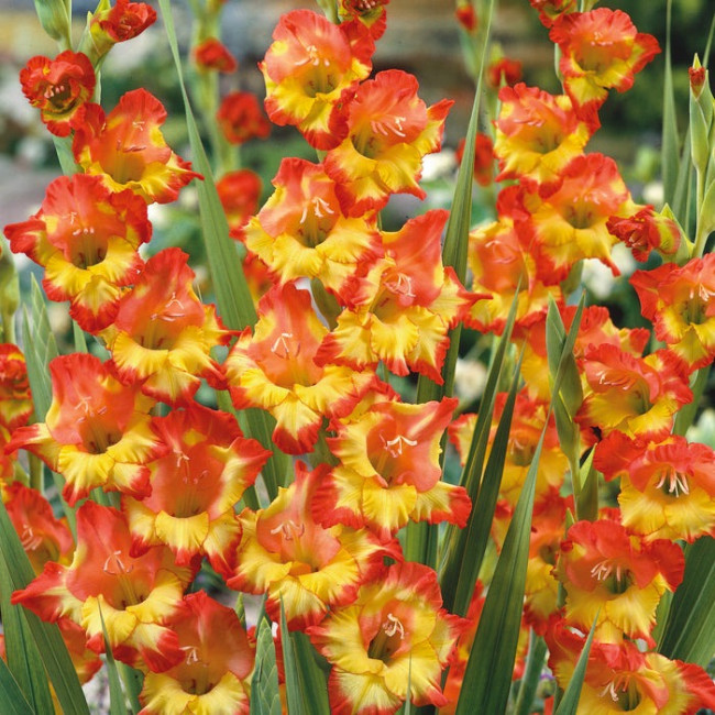 Дерзкий и смелый! 10-12 лимонно-желтых цветков (до 10 см в диаметре) с контрастной алой каймой дружно раскрываются в колосовидном соцветии. Ослепительные вертикальные акценты в группах и смешанных композициях в саду и кашпо, торжественные букеты. Прочные цветоносы не нуждаются в поддержке.