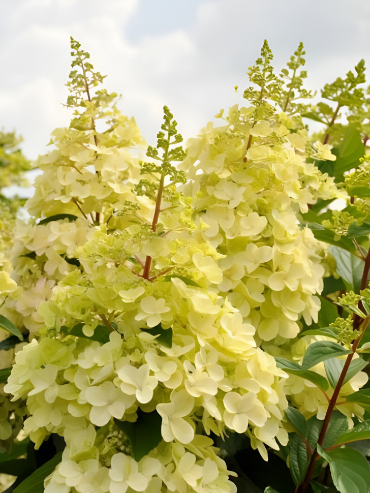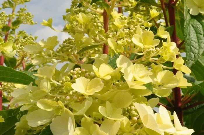 Стерильные цветки, а их большинство, с 4-5 лепестковидными чашелистиками, слегка удлиненными, вершина которых с небольшой выемкой в виде сердечка. Лепестки едва перекрывают друг друга и немного приподняты вверх, создавая чашеобразную форму. Цветки сначала жёлто-зелёные, затем приобретают кремово-золотистый оттенок. Цветение пышное, продолжительное.