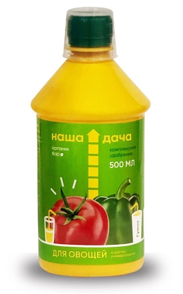 «Наша Дача» для овощей и цветов. Универсальное - Жидкое органо-минеральное удобрение для овощей и цветов на основе природных стимуляторов роста – гуматов. Стимулирует рост, увеличивает размер плода, улучшает вкусовые качества плодов, повышает устойчивость к болезням. Улучшает структуру почвы Обеспечивает быстрый начальный рост растений Формирует бутоны, завязываемость плодов Способствует длительному и обильному плодоношению Повышает иммунитет растений Обеспечивает урожайность ПРИМЕНЕНИЕ Апрель - Октябрь 1 раз в неделю. Корневая подкормка: отмерьте 20 мл (целый колпачок) и разведите в 2 л воды. Норма расхода как при обычном поливе. Внекорневая подкормка: отмерьте 10 мл разведите в 2 л воды (1/2 колпачка). Опрыскивайте поверхность листьев, исключая попадания раствора на цветки или опушенные листья. Чередование корневых и внекорневых подкормок: 1 раз в 7-14 дней. гумат.jpgNPK.jpg+микроэлементы.jpgБольше органики.jpgмерныи? стаканчик.jpg СОСТАВ Содержание макроэлементов: N - 9,8, P - 7, K - 19, Mg - 1,8, S – 1 г/л Содержание микроэлементов: Fe - 28, Zn - 28, Cu - 20, Mn - 84, Mo - 8, B – 41 мг/л