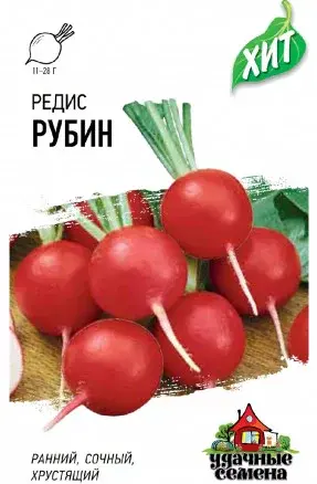Раннеспелый (26-28 дней от всходов до технической спелости) сорт. Розетка полураскидистая. Корнеплод красно-малиновый, округлый, диаметром 3,2-4,5 см, с гладкой поверхностью. Почти полностью погружен в почву. Мякоть белая или бело-розовая, плотная, сочная, сладкая, слабо острого вкуса. Масса корнеплода 11-28 г. Ценность сорта: дружная отдача урожая, отличные вкусовые качества. Рекомендуется для выращивания в открытом и защищенном грунте. Урожайность 1,2-2,3 кг/м2. Выращивают прямым посевом в открытый грунт на глубину 1-2 см.