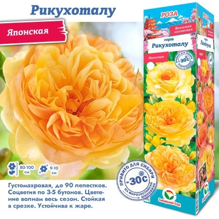 Сорт японской розы группы флорибунда. Куст полураскидистый, ветвистый, высота — 80–100 см, ширина — 60–70 см. Листва глянцевая, тёмно-зелёная. Цветки махровые, чашевидные, диаметр — 8–10 см. Основная окраска — жёлтая или персиковая. Цветение: повторное, в соцветиях из 3–5 цветков. Аромат интенсивный, с цитрусовыми оттенками. Цветы сохраняют свежий вид до 7–9 дней.