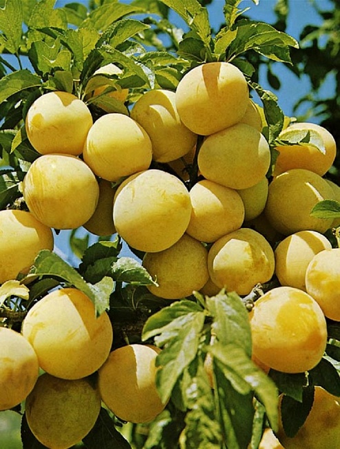 Среднего срока созревания. Дерево среднерослое с приподнятой овальной кроной средней густоты. В плодоношение вступает на 3-4-й год. Побеги тонкие, прямые, коричнево-бурые, опушенные. Листья средние, обратнояйцевидные, темно-зеленые, гладкие, матовые с городчатым краем. Плоды округлые, крупные, желтые, средней массой 30 г. Мякоть желтая, кисло-сладкая. Косточка хорошо отделяется от мякоти. В плодах содержится: сухого вещества 14,05%, сахара 10,75%, кислоты 1,0%, витамина С 3,52 мг%. Дегустационная оценка 4,5 балла. Средняя урожайность 112 ц/га. Морозоустойчивость высокая. Сорт устойчив к болезням и вредителям.