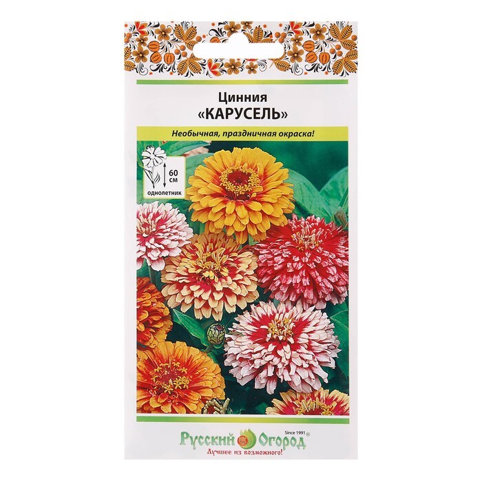 Цинния Карусель – смесь необычных густомахровых цветов самых разных окрасок. Высота растений 60 см, что даёт множество вариантов для посадки в цветнике. Можно сочетать с другими цветами насыщенных оттенков или обратить внимание на более низкорослые смеси цинний (например, смеси Персидский Ковер, Компакт F1, Кристал). Также можно посадить их отдельной группой. Однако, следите, чтобы цветы получали достаточно солнечного света! Ведь цинниям он очень необходим для стремительного развития.