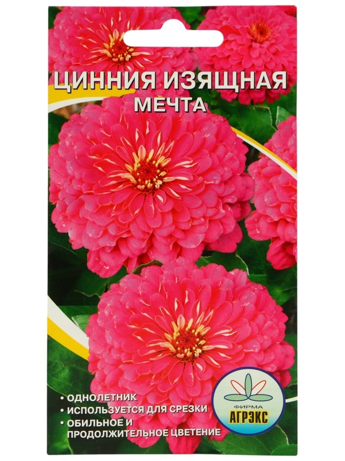 Цинния георгиноцветковая «Мечта» — цветущий однолетник с крупными (8-10 см) полусферическими розово-лавандовыми цветами. Куст ветвистый от основания, вырастает до 80 см. Используется для украшения цветников, рабаток, составления букетов. Любит освещенные клумбы, выдерживает засуху, боится заморозков. Цветет с июля до холодов. Посев на рассаду производят в апреле.