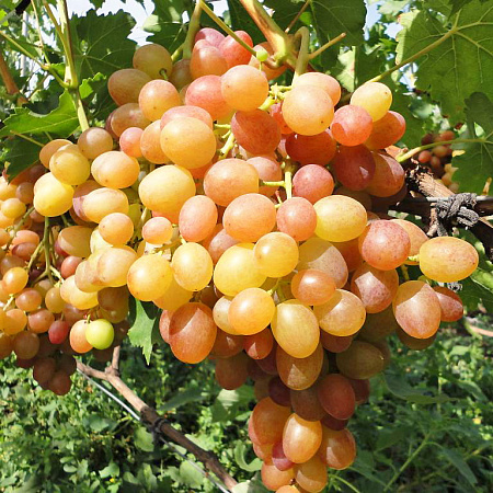 Кусты Хамелеона высокие (до 2-х метров), сильнорослые, раскидистые. Такими роскошными кустами с тёмно-зелёной кроной и шикарными разноцветными гроздьями обладает далеко не каждый сорт винограда. Интенсивный рост побегов требует регулярной обрезки. Хамелеон очень ранний сорт, созревает за 100-110 дней от распускания листьев. Это ориентировочный срок созревания, он зависит от погодных условий в конкретный сезон, условий выращивания, климатической зоны, ухода. У Хамелеона крупные, увесистые гроздья правильной конической формы весом 1000-1500 г, а при особенно благоприятной погоде и правильной агротехнике могут достигать 2000 г. Средняя длина грозди 30-35 см. Крупные ягоды весом 12-14 г в гроздьях располагаются плотно. Кожица плотная, съедобная, хрустящая при надкусывании. Окраска ягод светло-розовая, янтарно-жёлтая, оранжево-красная, золотисто-бежевая и другие оттенки цветовой гаммы, что создаёт бесподобный товарный вид продукции. За эту особенность сорт и получил своё название. Цвет плодов не влияет на вкус. Зелёные ягоды медленно набирают окраску, но в конце срока созревания, даже будучи зеленоватыми, уже имеют превосходный гармоничный вкус. Ягоды нежные, сладкие, кислинка практически не чувствуется. Соотношение сахаров и кислот значительно перевешивает в сторону сахара (сахар до 22-24%, кислота 5-6 г/л). Для Хамелеона характерна высокая стабильная урожайность более 30 кг с куста. На плодородных почвах при благоприятных условиях большие взрослые кусты могут дать до 50 кг.